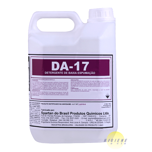 Propriedades: DA-17 é um detergente limpador concentrado de baixa espumação, destinado á limpeza pesada de pisos: porcelanato, vinílico, cerâmica, granilite, epoxi e pedras em geral em áreas de médio e alto tráfego. O DA-17 é composto de detergentes sintéticos de última geração, combinados com substâncias umectantes e quelantes que fazem com que ocorra uma rápida penetração e emulsificação de sujidades secas e oleosas. DA-17 é eficiente em diluições altas com água, sendo assim um produto economico e versátil, podendo ser utilizado manualmente ou em lavadoras automáticas, devido a sua baixa espumação.