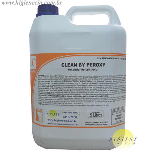Clean By Peroxy atua em gorduras e oleosidades (animal, vegetal e mineral), fuligens, terra e sujidades provocadas por mofo, agindo através da penetração e quebra da molécula da sujidade em pequenas partículas, facilitando a sua remoção em superfícies laváveis tipo: cerâmicas, porcelanatos, azulejos, paredes, fórmica, aço inoxidável, cromados, plásticos, vidros, espelhos, pisos tratados com acabamento acrílico, carpetes e estofados.